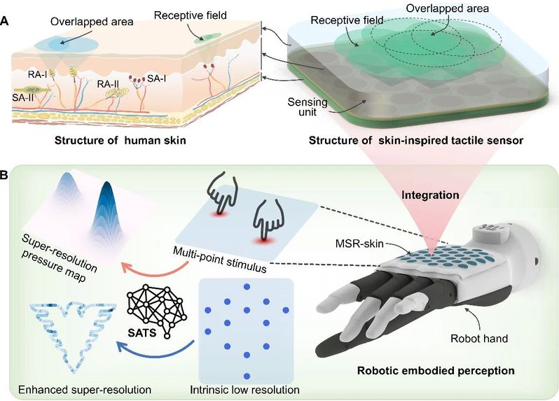 图1. 受人体皮肤启发的触觉传感器设计及超分辨率触觉感知