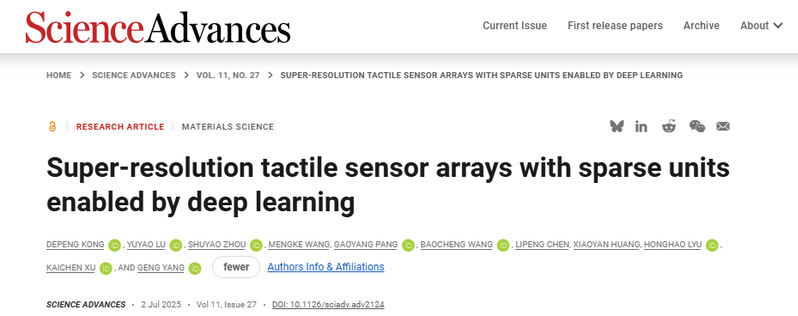 针对上述问题,浙江大学流体动力基础件与机电系统全国重点实验室杨华勇院士团队提出了一种深度学习驱动的触觉感知增强方法,通过智能算法和传感器硬件结构的软硬件协同设计,基于稀疏硬件结构实现了超分辨率触觉感知。相关研究以“Super-resolution tactile sensor arrays with sparse units enabled by deep learning”为题发表于国际知名学术期刊《Science Advances》。孔德朋博士为论文第一作者,杨赓研究员和徐凯臣研究员为论文通讯作者。本研究工作得到中国电子学会-腾讯RoboticsX犀牛鸟专项研究计划资助,国家自然科学基金(No. 52375031, 52475610)、浙江省自然科学基金杰出青年基金(No. LRG25E050001)、浙江省自然科学基金重大项目(No. LDQ24E050001)的支持,同时联合深圳市星源材质科技股份有限公司开展技术转化推广应用。