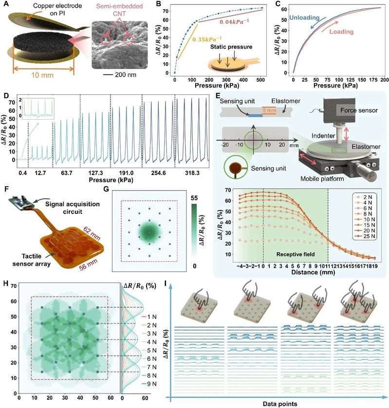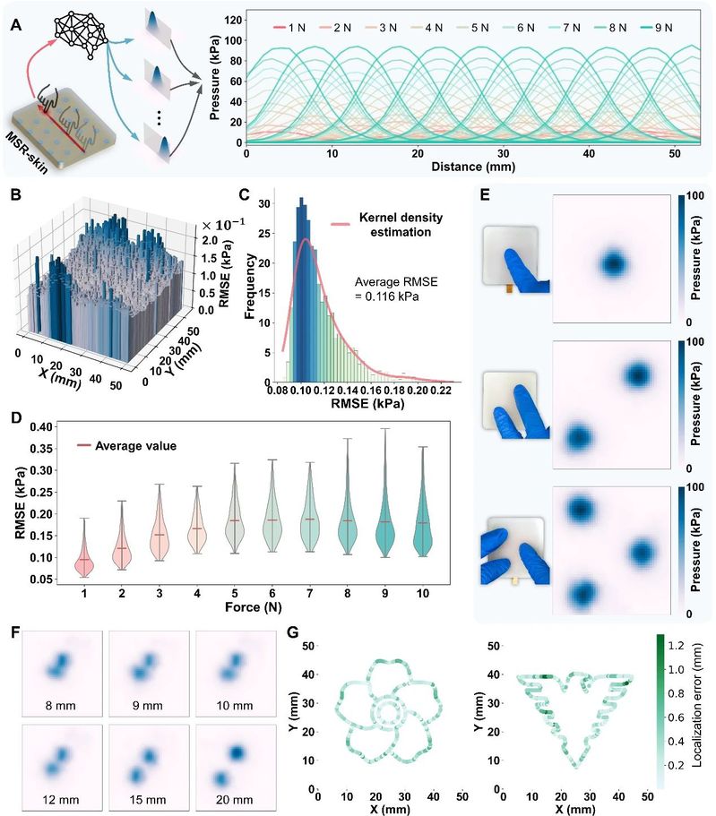 基于上述软硬件设计协同设计方法,制备了具有压阻效应的功能材料和触觉传感单元(图3A-D),并依据上述拓扑寻优结果和实测感受野(图3E)构建了一个具有23敏感单元的传感阵列(图3F)。该传感阵列的有效感受野如图3G-H所示,其对外界单点/多点刺激的响应特性如图3I所示。