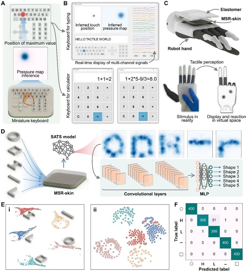 借助于对外界刺激的高精感知能力,该传感系统能够适用于多种对空间分辨率具有高需求的应用场景,如图4G展示了对两个复杂轮廓上刺激点位的精准检测识别。进一步将键盘微型化至传感平面上的一个局部区域,实现了对按压键位的精准检测,完成了打字输入以及计算器相关应用展示(图5A,视频2)。另外,该传感系统能够有效实现向机器人体表的集成并提供触觉感知功能,提升人机交互的效率和智能化(图5B)。本工作区分于现有触觉超分辨率工作的一个重要特征在于其可以实现对压强分布的连续检测,因此能够实现对接触形状的成像,进一步结合图像分类算法最终实现了对5种接触形状的准确识别,识别准确率98.35% (图5E-F,视频3)。