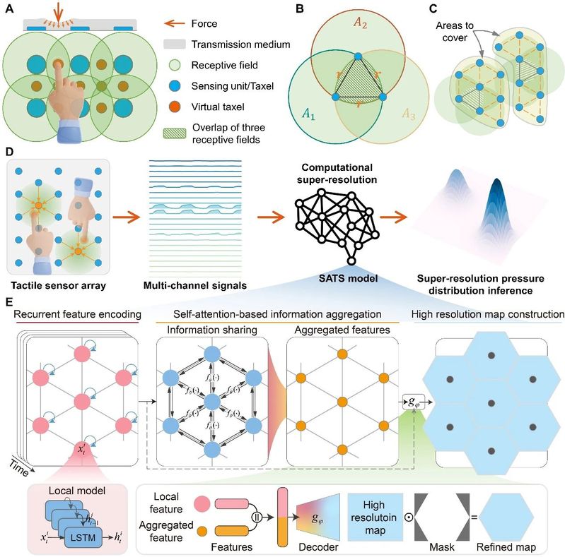 触觉感知是机器人感知自身和环境的关键维度之一,能够显著提升机器人的作业精度和安全性,是新一代机器人系统不可或缺的组成部分。为了获得更高精度以及更丰富的触觉传感信息,传统方法需要在单位面积里集成尽可能多的触觉敏感单元,实现硬件层面的空间分辨率提升。然而这种方式存在以下问题:1) 传感器的空间分辨率受限于敏感单元的数量,并直接对制备和集成工艺提出了较高的要求;2) 高密度集成容易引起相邻敏感单元之间的信号串扰且难以解耦;3) 大量敏感单元的信号采集和读取线路错综复杂,直接影响传感系统整体稳定性和可靠性。