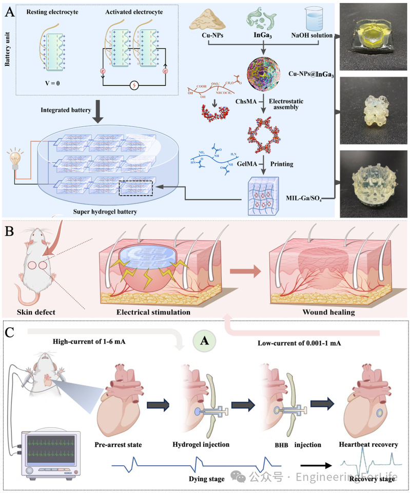 为此,EFL团队提出了一种新型电池构建策略:生物水凝胶电池 (Bio Hydrogel Battery, BHB),该电池由具备优异生物相容性的水凝胶与金属纳米颗粒协同组装而成,其力学性能与软组织高度匹配,可在组织再生过程中提供0.001–1 mA的微电流,并在心脏起搏等高负荷应用中稳定输出1–6 mA的大电流。通过灵活的调控设计,BHB展现出对生理需求的动态响应性与高精确性。这一体系巧妙地将可降解性与功能稳定性统一, BHB为柔性植入式智能设备开辟了全新路径。