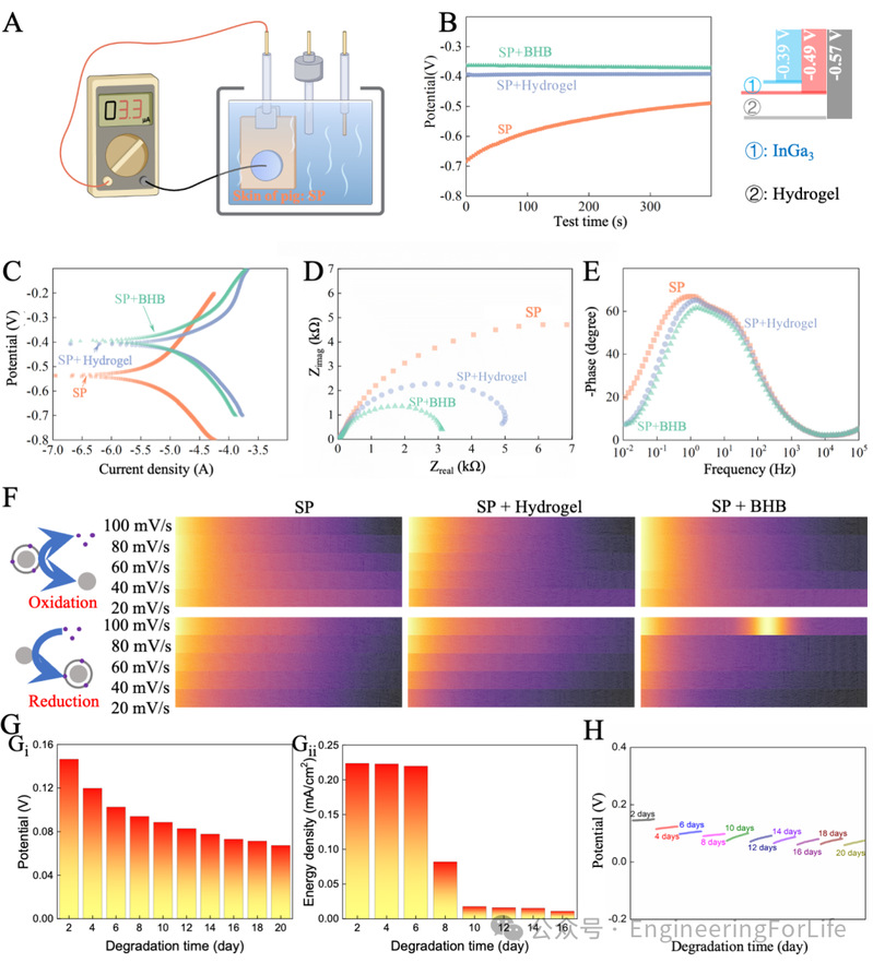 电化学性能测试表明,光固化打印制备的BHB可在组织表面释放微弱电流(0.0033 mA),并在猪皮肤模型中实现稳定电输出。开路电位(OCP)和极化曲线分析显示,BHB较水凝胶具有更低的电荷转移阻抗(Rct),体现出更优的离子扩散与电荷传输能力。循环伏安(CV)结果揭示,InGa₃–Cu–NPs赋予BHB更强的氧化还原活性与电流响应。随体外降解进行,BHB在前10天可维持336 mA·h的容量,能量密度在第10天前保持基本稳定,20天后因水凝胶完全降解而电流骤降。长期电化学阻抗谱(EIS)进一步确认,BHB在降解过程中依然保持较好的电化学稳定性。整体结果表明,BHB兼具稳定供电能力与可降解特性,为组织修复与植入电子提供了可靠电源。