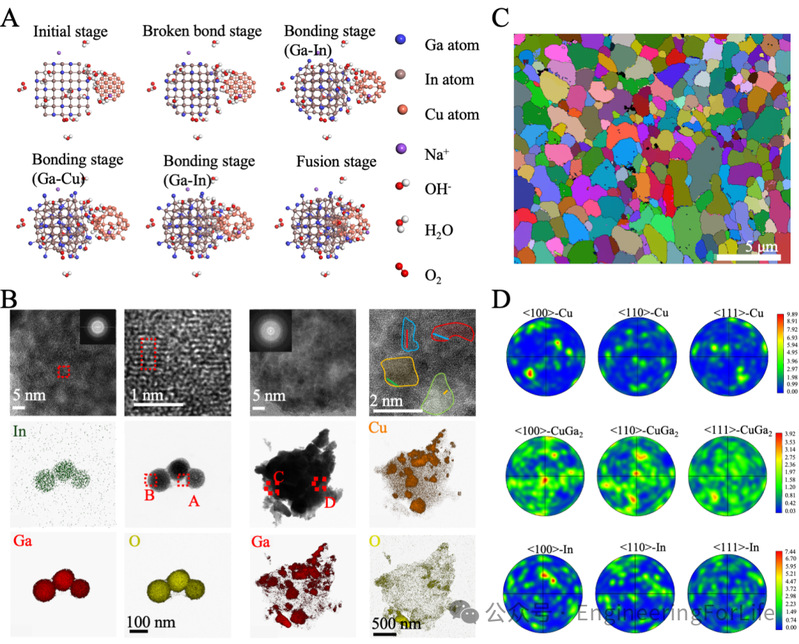 在BHB中,Cu纳米颗粒与InGa3在NaOH溶液中发生化学蚀刻与键合反应,经历了从Ga–In键断裂、Ga–Cu键形成到最终融合的六阶段过程,形成了InGa3与Ga2Cu的纳米嵌入结构。TEM及EDS表征显示,纯InGa3表面形成氧化膜,而InGa3–Cu–NPs则表现出Ga、In、Cu富集区域,对应InxGay和GaxCuy新相的生成。其典型结构为InGa3核与Ga2O3壳的核–壳形貌,壳层呈致密陶瓷状,具优异力学性能。高分辨TEM揭示了GaxCuy具有良好的FCC晶体结构,而InxGay为BCC结构,晶体质量略低。XPS映射和光谱证实Cu的引入提高了元素分布的均匀性和材料密度。XRD与EBSD进一步表明,在蚀刻作用下形成了晶粒细化的CuGa2相,缺陷更少,结构更稳定,为电化学性能的提升奠定了基础。
