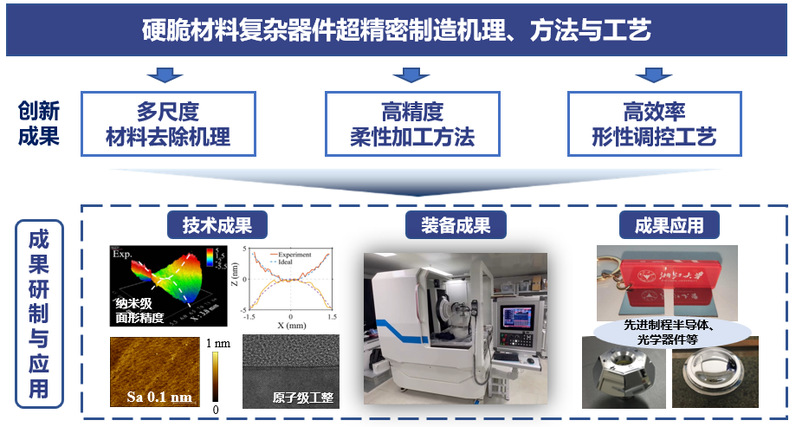 围绕先进制程半导体、先进光学器件等硬脆材料复杂器件极端制造需求,从多尺度材料去除机理、高精度柔性加工方法、高效率形性调控工艺等三个方面,开展超精密制造机理、方法与工艺研究,解决了传统制造方法精度难突破、形性难调控等技术瓶颈。项目研制了性能指标优异的硬脆材料复杂器件柔性超精密加工装备,实现了高性能制造装备的自主化研制,相关成果支撑了国家重大装备关键核心器件研制。