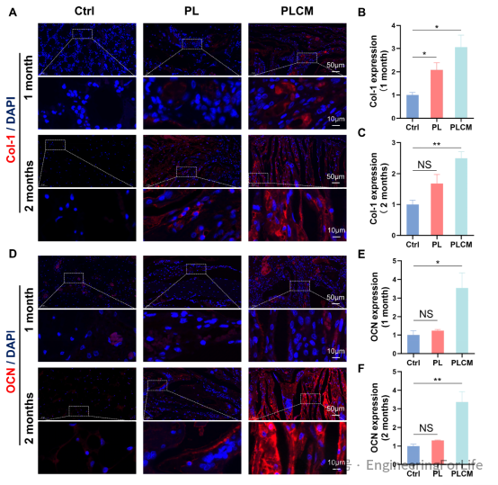 体内层面:在兔股骨临界尺寸缺损模型中,电池支架展现了良好的修复效果:术后1个月和2个月的Micro-CT扫描显示,PLCM组的新生骨量(BV/TV)远超对照组和纯支架组。对照组(Ctrl)仅在缺损边缘有稀疏骨生成,纯支架组(PL)得益于冷冻铸造的定向孔隙,观察到了一端的骨长入,但中心区域仍有空缺。电池支架组(PLCM)展现了最佳的骨整合效果,新骨沿着定向通道快速向中心渗透,在术后2个月时,骨缺损区域几乎被完全填充,实现了较好的骨桥接。组织切片进一步揭示了新生骨质量,Masson三色染色显示,PLCM组生成了大量代表成熟骨组织的深蓝色胶原,而其他组多为代表未成熟骨或纤维组织的浅蓝色。免疫荧光染色定量分析显示,PLCM组中I型胶原蛋白(Col-1)的表达量是对照组的 2-3倍,而骨钙素(OCN)的表达量是对照组的近4倍。