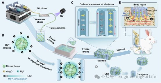 为了构建这种集结构与功能于一体的支架,研究团队受莲蓬结构启发,采用冷冻铸造(Freeze-casting)技术制备了聚(L丙交酯-己内酯)(PLCL)定向多孔骨架。在制备过程中,通过微流控技术制备的负载纳米氧化镁(nMgO)的改性壳聚糖微球(CMAM)被均匀分散在骨架中。PLCL骨架不仅提供了必要的力学支撑,其内部独特的纳米级孔隙充当了“电荷存储域”,而微米级定向通道则如同“高速公路”般引导离子迁移;嵌在其中的CMAM微球则作为持续释放Mg²⁺的能源核心。这种设计巧妙地将能量存储模块与能量供应模块集成在了一个可降解的支架实体中。
