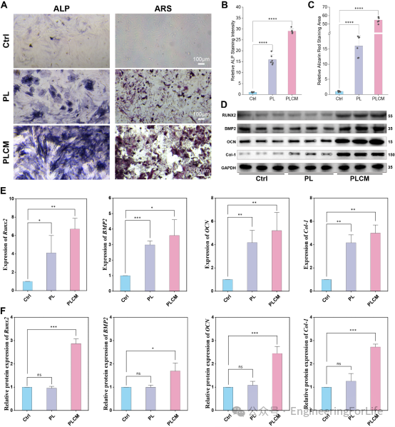 体外层面:研究团队首先验证了支架的生物相容性,证实其具有良好的血液相容性(溶血率<5%)且能维持骨髓间充质干细胞的高活性(>95%)。在此基础上,进一步揭示了其卓越的促成骨能力:碱性磷酸酶(ALP)是成骨分化的早期标志物,在培养14天后,PLCM支架组的ALP活性是纯PLCL支架组的2倍,染色结果显示出更深、更密集的阳性区域,表明PLCM支架能更快启动细胞的成骨分化程序。作为骨成熟的关键指标,茜素红S(ARS)染色结果显示,相比于对照组零星分布的钙化点,PLCM组呈现出大量成簇的红色钙化结节。定量分析表明,其矿化结节数量是纯支架组的近4倍,有力证明了Mg²⁺释放与电刺激协同加速了骨基质的矿化沉积。在分子水平上,qPCR和Western Blot检测均证实,Runx2、BMP2、OCN和Col-1等关键成骨基因及蛋白在PLCM组中的表达水平显著高于其他各组。上述结果从机理上表明电池支架通过激活成骨信号通路,有效提升了骨髓间充质干细胞的成骨能力。