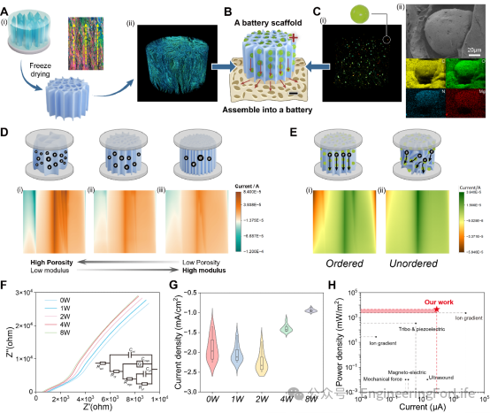 为此,团队在前期的工作“biohydrogel battery”(Cell Biomater. 2025)工作的基础上,进一步提出“Battery scaffold”(生物电池支架)这一全新概念,将结构引导(Structural guidance)、生化信号(Biochemical signal)和电刺激(Electrical stimulation)耦合在同一个生物支架中。