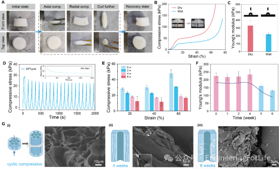研究团队对支架的力学性能进行了系统评估,发现其具备独特的水响应形状记忆行为:干燥状态下的大应变压缩不可逆,但一旦完全水合,支架能在1分钟内从轴向、径向压缩甚至卷曲变形中迅速恢复初始形状,这种特性赋予了其在微创手术中填充不规则缺损的巨大潜力。力学测试表明,水合支架的杨氏模量为225 kPa,且在循环加载下展现出优异的回弹性与可靠的形状恢复能力。在体外模拟降解过程中,支架的力学性能演变与骨再生进程高度同步:在前4周的“黄金窗口期”内,杨氏模量始终维持在200 kPa以上,第4周因矿化沉积出现小幅提升,随后在第5至6周才开始显著下降与结构破碎。微观结构分析揭示,支架层板内部呈现出类似珍珠层的堆叠纳米片形态,这种仿生构型不仅增强了材料的韧性与弹性,更为电荷存储和定向电流传导提供了关键的物理基础。